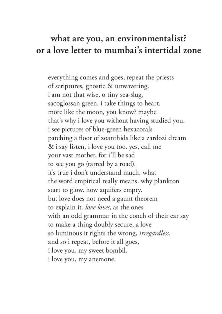 Who’s the one Indian poet, besides yourself, whose work speaks to you? Lots, I think. It’d be difficult to name just one person and it also changes all the time. These days, I am thinking of this poem by Nikita Deshpande.